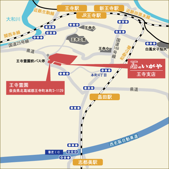 JR王寺駅・近鉄王寺駅・新王寺駅よりバスで約5分 「王寺霊園前」下車すぐ