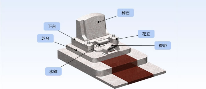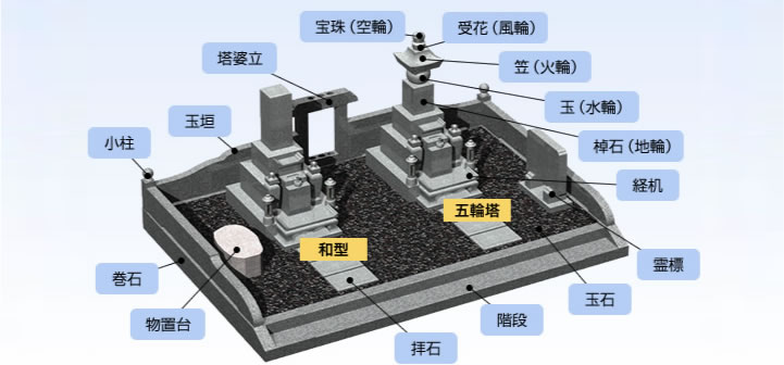 お墓は、様々なパーツや装飾品で成り立っています。和型・洋型でも構造が異なります。