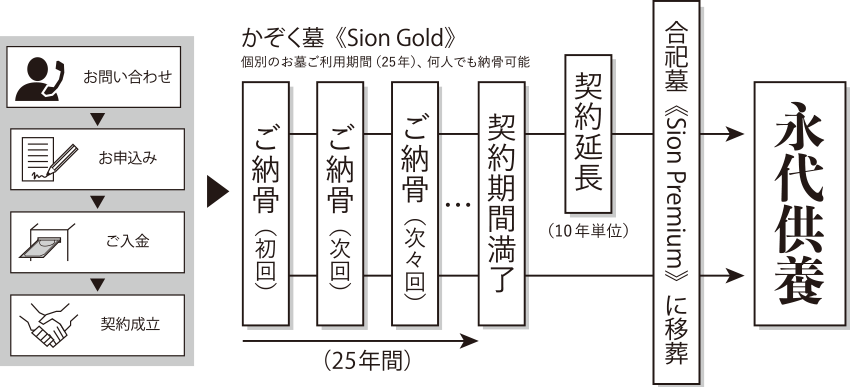 一定の年数(25年)が経ちましたら、お墓を継ぐ方がいなくても、合祀墓《Sion Premium》に移葬し、永代にわたりご供養いたしますのでご安心ください。延長ご契約も可能です。